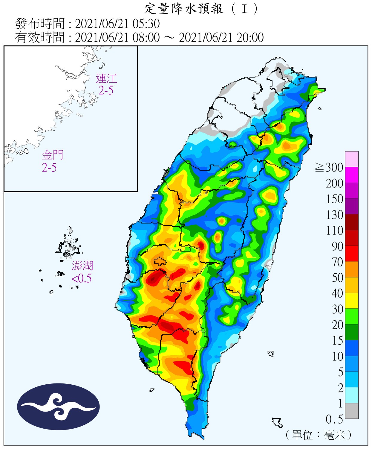 台灣在經過好長一段時間缺水日子,老天終於聽到人民心聲,在6月開始帶給台灣大量降雨,現在又有一波致災性降雨,受到西南風影響,氣象局今(21)日持續發布豪大雨特報,其中,彰化縣有局部豪雨或大豪雨,台中市、南投縣、嘉義縣、台南市、高雄市及屏東縣有局部大雨或豪雨,苗栗、雲林及嘉義市有局部大雨發生的機率。