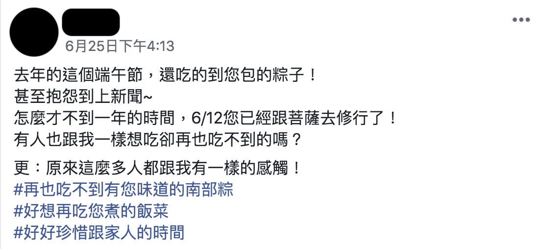 ▼今年那名男網友再次發文,這次卻不是炫耀媽媽的粽子,而是不捨地說,媽媽已經在6月上旬跟菩薩去修行,不能再給他包粽子了。他非常想吃媽媽的味道,但再也吃不到了。這讓他無限感慨:「好想再吃您煮的飯菜」、「好好珍惜跟家人的時間」。
