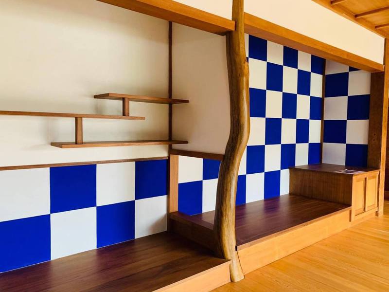 逍遙園的室內採用了超過10款建築木料,還有非常多日式的獨特工法,例如二樓室內天花板飾面就採用了「竹編網代天井」的日系特殊工法、屋頂瓦片則是精緻的合興窯黑瓦,藍白格子壁面的市松紋也非常獨特~
