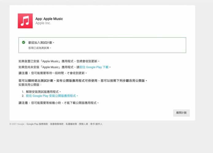 自從 Apple 發佈了 Apple Music 無損音樂的串流播放服務,並且支援杜比全景聲(Dolby Atmos)及空間聆聽音訊(Spatial Audio)功能後,一直只有 Apple 的 iOS 用戶才能享用。不過 Apple 最近向 Android 版的 Apple Music 用戶釋出 Beta 版,讓想事先體驗這項新功能的 Android 平台用戶加入 Apple Music 的測試計劃,用戶要到Google Play 相關頁面 申請成為測試員 (如下圖):