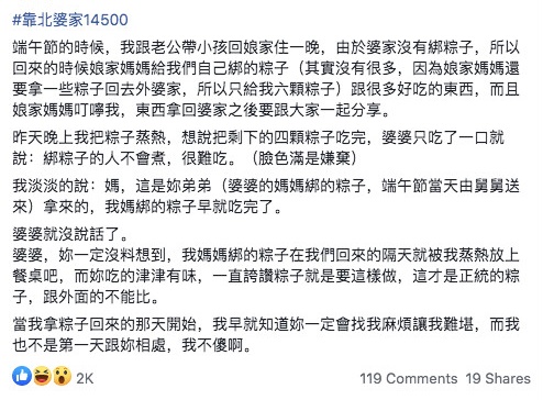 據《三立新聞網》報導,這位人妻在臉書「靠北婆家」發文,表示某次端午節時,自己和老公帶著小孩回到了娘家住一晚,在離開之前,媽媽想起她的婆婆沒有包粽子,於是就拿了6顆讓她帶回去分享給親家。後來隔了幾天,她把冰箱裡剩下的粽子拿出來蒸熱,結果婆婆只吃了一口,就滿臉嫌棄地說「綁粽子的人不會煮,很難吃」,似乎拐著彎想給她難堪。