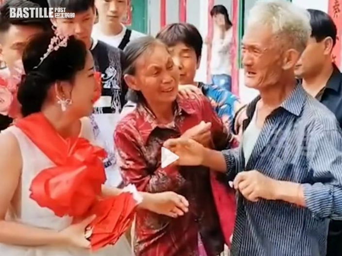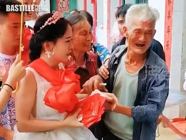 據報,新娘子穿著婚紗緩緩走出家門,其外公突然一邊哭一邊跑到孫女面前,又抓著她的手不放,一邊翻找衣服和褲子的口袋,想拿紅包給孫女當零用錢。
