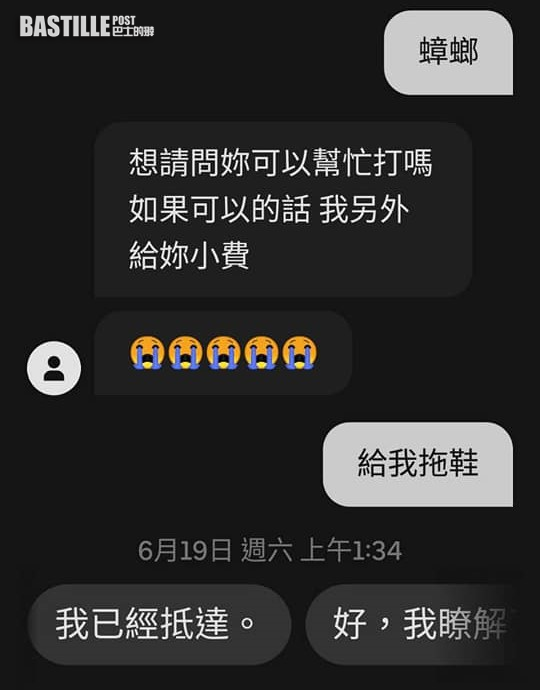 對方先是問「請問你敢打蟑螂嗎?」,更稱「我們兩個女生都非常害怕⋯⋯不敢出房門。」,之後則請求她「可以幫忙打嗎?如果可以,我另外給妳小費」。哭笑不得的外賣員只好回覆「給我拖鞋」。該名外賣員也在文中附上戰果照片,果然成功完成任務。