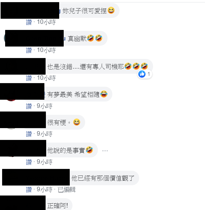 看到兒子這樣有創意的聯想,讓媽媽看了會心一笑,直呼:「虧他想得出來。」很多網友看到後,也都紛紛大讚:「邏輯很清楚耶!」、「小朋友年紀小小,想法很正確!」、「對耶,公車也是百萬名車,真的是很厲害的小朋友,將來一定很有前途!」還有網友笑說:「他忘了說,還有司機專門接送!」笑翻一票人。