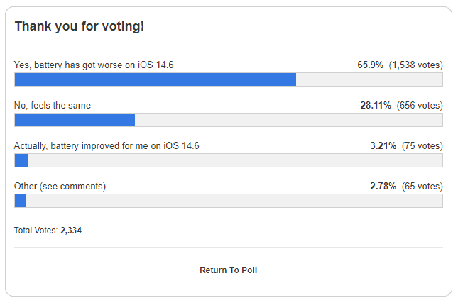 而亦有外媒向讀者進行訪問得出近六成半人有出現上述問題,似乎必須 Apple 正視問題根源,並從下一次的更新中解決。不過 Apple 目前對 iOS 14.6 的電池消耗問題尚未回應。而現時 Apple 正處於測試 iOS 14.7 的初期,但 iOS 14.6.1 系統更新或可能即將發佈,因此更新出現問題的用家可能要再等一下了。