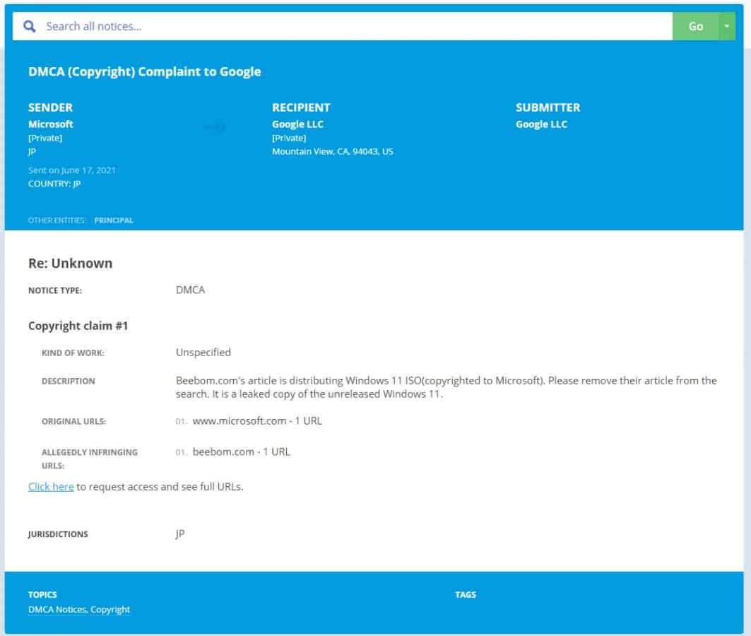 這次出現 Windows 11 名字的官方文件,並非直接在宣傳之中用到,而是針對一個網上流出版本的 ISO 檔案提出的 DMCA 移除通知書。Microsoft 在向 Google 發出的通知書中明確表示,網站發佈的是流出版本的 Windows 11 ISO,也就是說這個產品確實就是名為 Windows 11。
