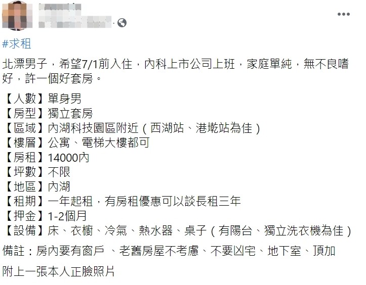 日前一名網友在臉書社團《台北租屋新北租屋》中表示,自己想要在北市內湖園區求租獨立套房,希望預算是1萬4000元,並排除凶宅、地下室、頂加等物件,「希望7/1前入住,內科上市公司上班,家庭單純,無不良嗜好,許一個好套房。」