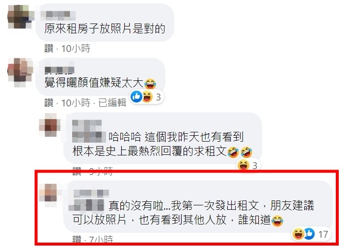 許多網友也表示:「謝謝原po 教會我以後要怎麼找房子」、「根本是史上最熱烈回覆的求租文」、「哇靠,是怎樣?純情房東俏房客?租屋多年,從沒遇過女房東,原來都在這了」、「學習了,下次找租屋要附上自拍照」原PO跳出來表示「初衷只是覺得形象好比較好租,沒想到...整個歪樓」
