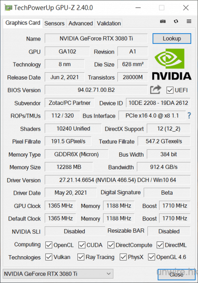 RTX 3080 Ti 的定位是在 RTX 3080 及 RTX 3090 之間,從核心的 CUDA Core 數量以致記憶體數量等亦可以看出。從 GPU-Z 的資訊可見,RTX 3080 Ti 使用 8nm 製程的 GA102 晶片,晶片與 RTX 3090 同樣,CUDA 核心的數量達 10240 個, 直逼 RTX 3090 的 10496 個,而記憶體數量 12GB GDDR6X,亦比 RTX 3080 多,記憶體頻寬亦跟 RTX 3090 一樣為 384-bit。換言之,RTX 3080 Ti 就是 RTX 3090 的微降格版,但唯一不同的是,這款 RTX 3080 Ti 並沒有 NVLink,只留在最高階的 RTX 3090 裡。但這已夠引起了不少讀者的疑問,到底 RTX 3080 Ti 能否挑戰 RTX 3090 的卡王地位?