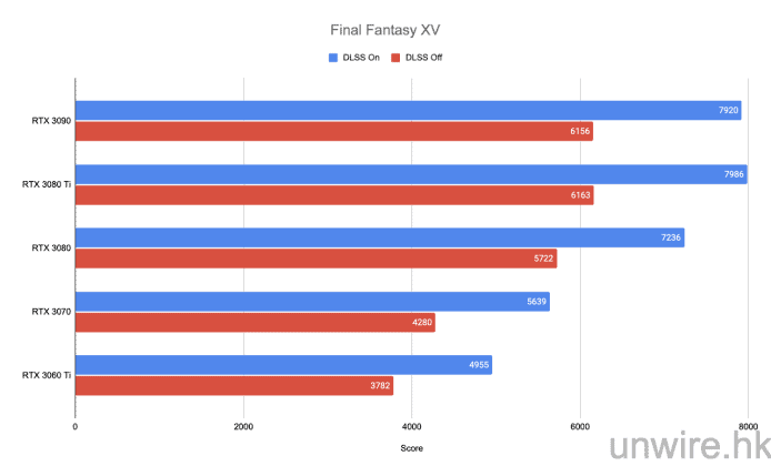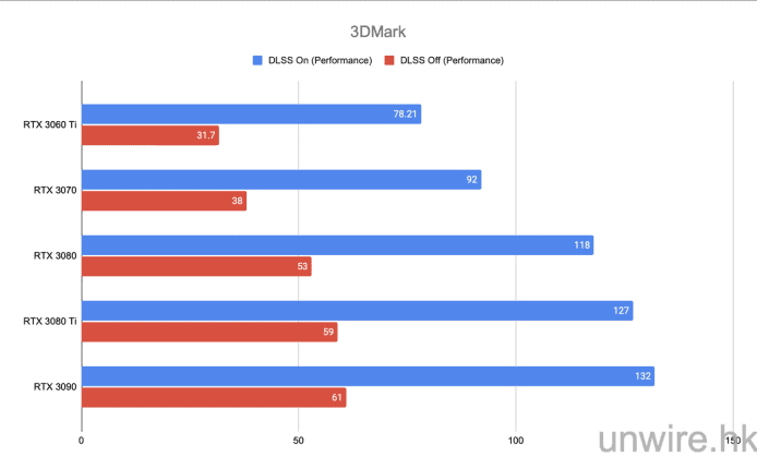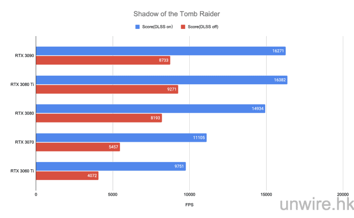 此測試筆者一樣將其設定為解像度 4K,所有畫質設定亦為最高,也會測試開啟 DLSS 後的分別。在這遊戲 RTX 3080 Ti 的分數不論有沒有開啟 DLSS 都更勝 RTX 3090。