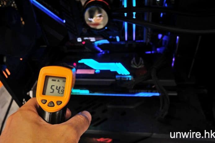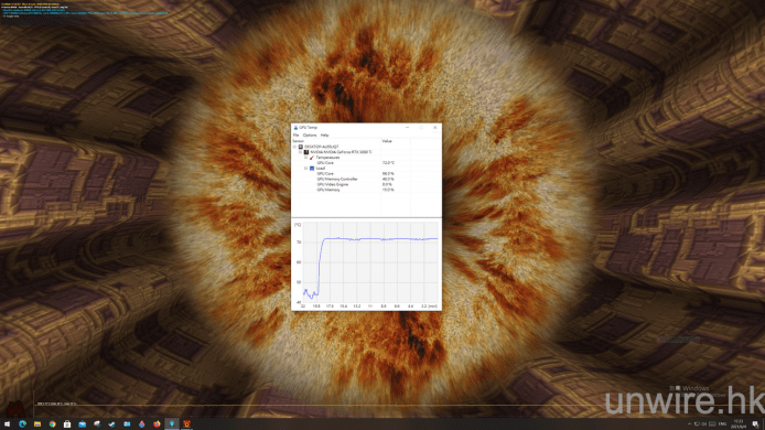 我們以 FurMark 軟件將 RTX 3080 Ti 運行至全負載狀態約 15 分鐘,期間我們以 GPU Temp 軟件記錄核心溫度。而經測試後發現,核心的運作溫度穩定地在 72 度,而在卡背的金屬板上面,我們以測溫槍探測近晶片核心的溫度,發現只有約 55℃,與 RTX 3080 的溫度相比還低兩度,可見改良了的散熱系統能夠在更高速度下維持較低溫度。
