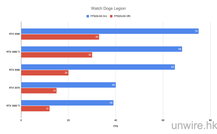 Watch Dogs Legion 身為次世代遊戲,無論光影追踪及 DLSS 技術都支,是很好的效能指標。所以我們均會測試開啟光追後對效能的影響,我們將解像度設定為 4K,畫質設定為最高,光追選項為「最高品質」,另外 DLSS 選項會選為「超高效能」。而分數上可見,RTX 3080 Ti 在沒有開啟光追下比起 RTX 3080 高出 10 FPS,但在開啟後則差別不大,證明 RTX 3080 Ti 的遊戲能力夠強。