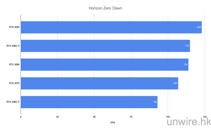 Horizon Zero Dawn 則沒有光追及 DLSS 技術,我們會將其畫質調至「極高」。測試後發現,RTX 3080 Ti 跟 RTX 3080 的差距幾乎沒有。