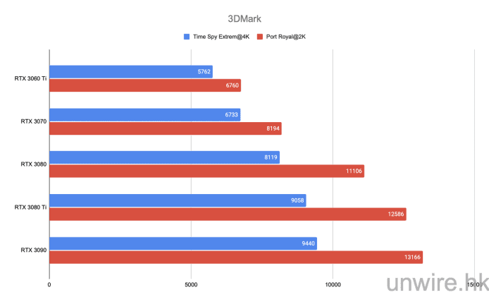 是次我們測試後,亦會與其他 RTX 30 系的顯示卡比較,讓大家有個更加清晰的概念。首先我們會在 3DMark 上分別執行 Time Spy Extreme、Port Royal 以及 DLSS 測試,其中 Time Spy Extreme 執行解像度為 4K,其餘兩個測試以 2K 解像度執行。