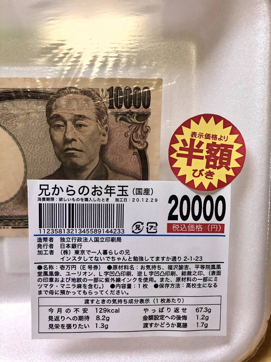 日前,日本有位網友在Twitter上分享一個超市常見的生鮮用包裝盒,仔細一看卻會發現上面標價寫著兩萬日圓,再貼上半價折扣標籤,而裡面裝的是一萬日圓紙鈔。推主也附言表示「這是給我妹妹的。」