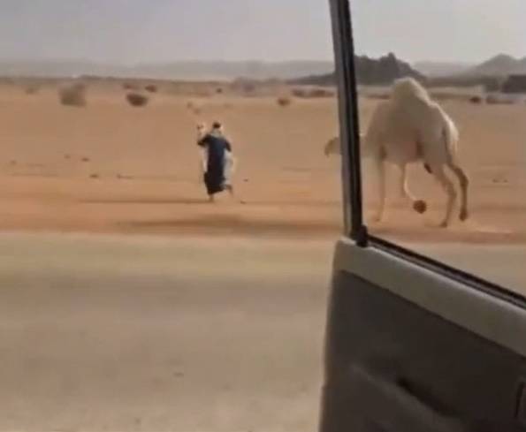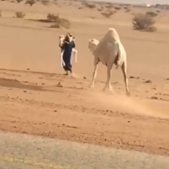 綜合外媒報導,日前有網民在論壇Reddit上載一段影片,顯示一位中東國家男子載著友人行駛在沙漠間的公路上,途中見到一對駱駝母子正橫穿馬路,男子立刻停住下車走向駱駝,突然就抱起了小駱駝奔跑。