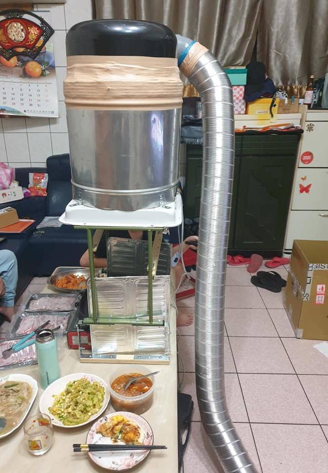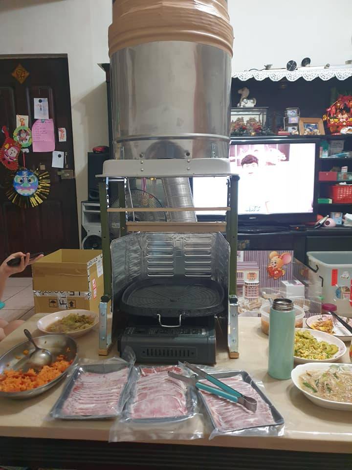 怎料有日,體貼的老公靈機一動,將廚房的抽油煙機管道延長至客廳,又自製抽風設備,打造出一部小型「抽油煙機」,從她分享的相片可見到,他們在客廳餐桌上放置了燒烤盤,上面則是加裝的抽風系統,這樣就可以放心在客廳烤肉,令人妻也感動大讚對方是「全能老公」。