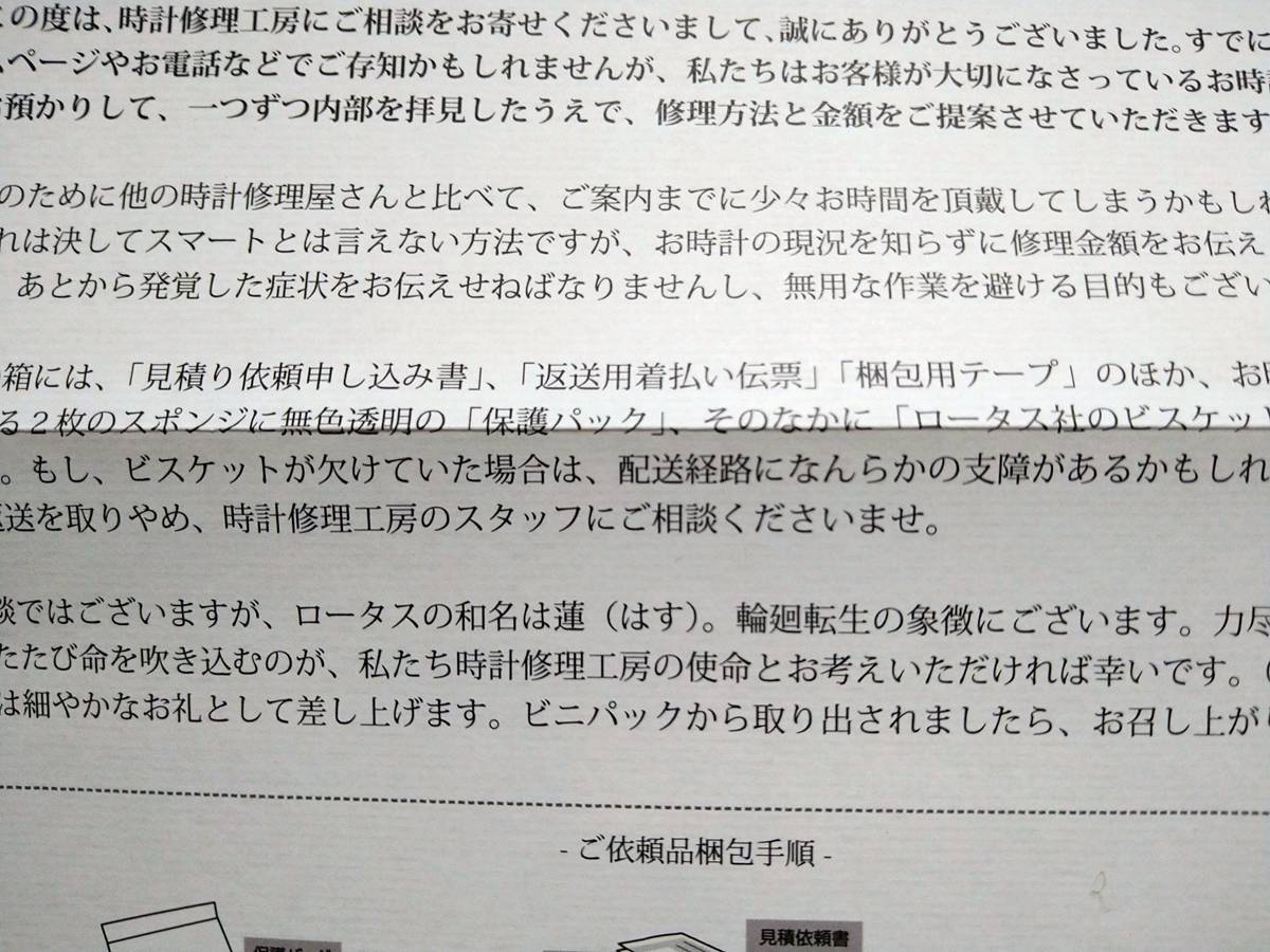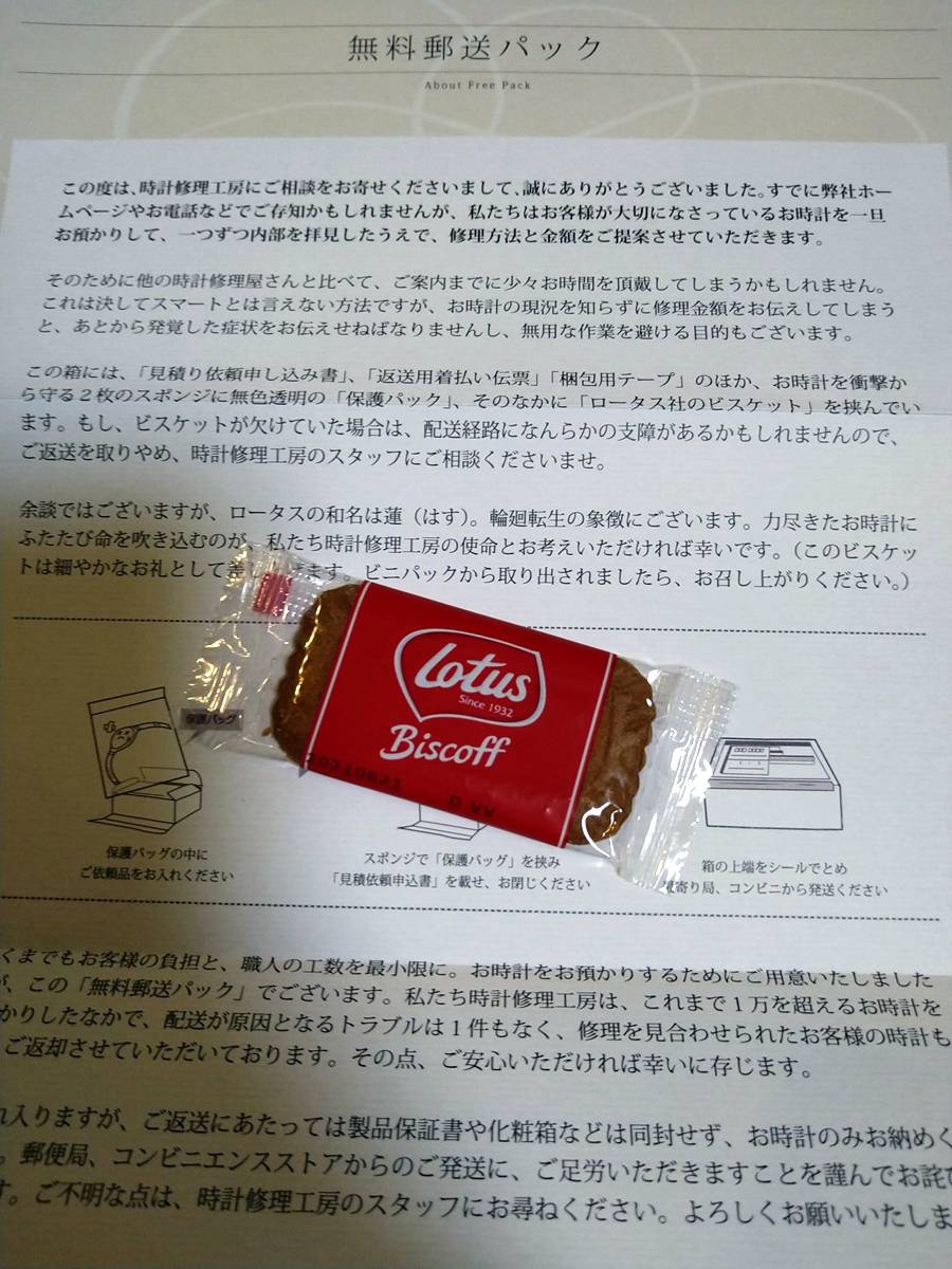 日前,有網友@MaikoTakigawa在Twitter上分享照片,指自己早前將一個壞掉的手錶郵寄至一間手錶店維修,而當手錶被寄回來時,包裹中還有一塊餅乾,令他感到奇怪。一開始他還以為是贈品,之後看到包裹中所附的信件才恍然大悟。