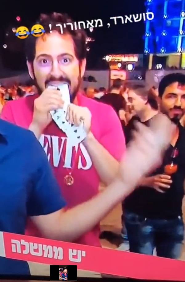 從曝光的電視畫面可見到,一名電視台記者正在戶外播報新聞,周圍還有不少民眾。而其中一名身著紅色T恤的男子在其身後探頭探腦,手中還拿著一副啤牌,接著便開始變起魔術。