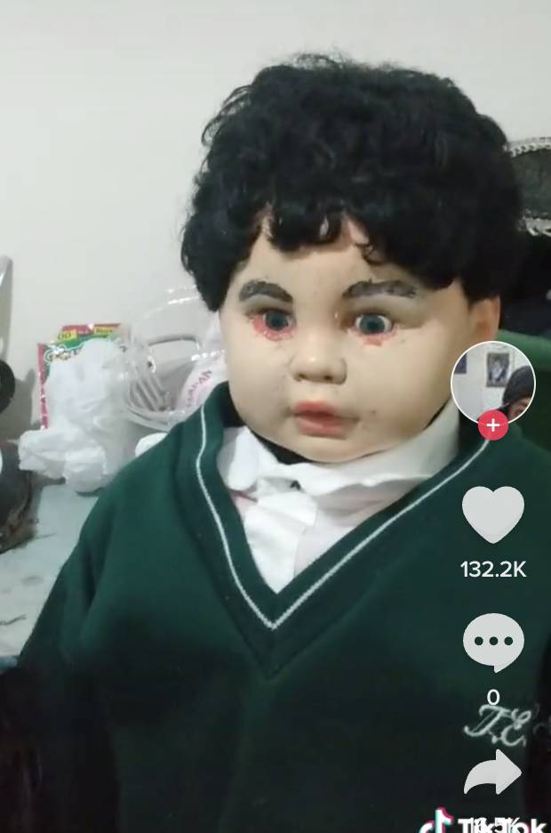 男網友@montbk5959的愛妻是一個真人大小的公仔,留著一頭黑色旁分長髮、細長的眉毛、粗框眼鏡和豐厚的嘴唇,雖然有些怪異,但宛如一名女子,而他也會每天幫其更換衣飾,並將兩人的合影、出遊畫面都上傳社交平台帳號,吸引1.3萬名粉絲追蹤,影片共累積15萬讚。