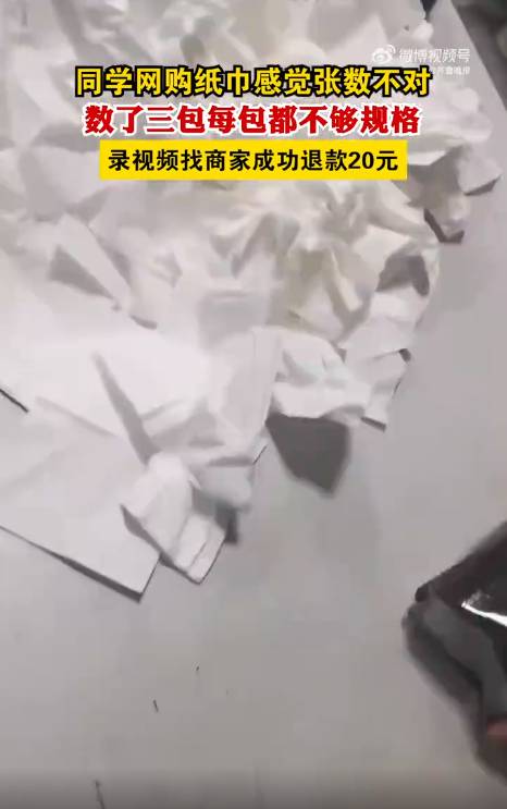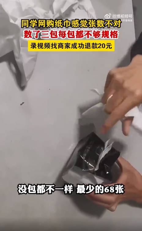 數了3包後,發現每一包紙巾數都少了近四分之一,有78和79張的,更誇張的有一包只有68張,他連忙將此跟商家反映。不過,商家一開始卻想敷衍了事拒不相信,還要求王同學以視頻作證,還好他早已拍下影片備用,令商家無法辯解,最終獲得20元人民幣的賠償。