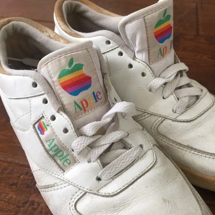 其實早在八、九十年代間蘋果公司卻在設計日常生活單品也花上不少功夫。上世紀80年代末,蘋果公司希望為員工提供服飾來營造出團結一致氛圍,一系列Tee、Polo Shirt、風褸、水樽與啤牌等大大小小的單品也包覽,直到現在古着文化重回時尚潮流,一眾蘋果收藏家對這批出土文物為之瘋狂,當中這雙蘋果Omega Sports Apple Computer Sneakers更被視為天價產物,才引發不少球鞋設計師爭相模仿,包括2018年Versace致敬款、2019年Concepts聯乘Mephisto版與三年前由訂製球鞋設計師Andrew Chiou的作品。
