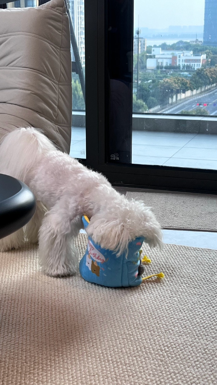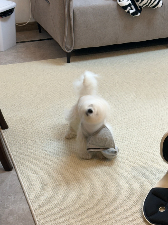 網友「Jeon-B」日前在微博分享,愛犬「燒賣」是魔天使(馬爾濟斯)和比熊混血的調皮汪星人,每天待在家裡卻有一個奇怪癖好,那就是拖著自己的貼身衣物到處亂跑。