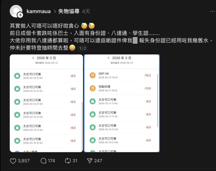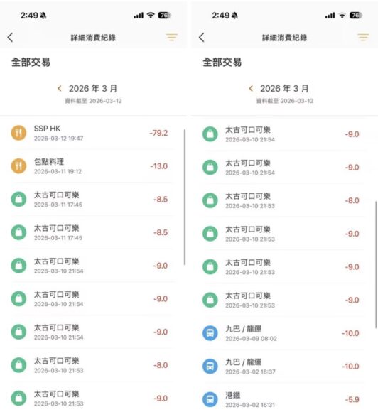 交易紀錄顯示,拾獲者在 3 月 10 日至 11 日期間,多次使用該八達通乘搭巴士及港鐵並購買食物。最令事主驚訝的是,對方曾連續購買 13 次太古可口可樂,每次金額約 8 至 9 元。