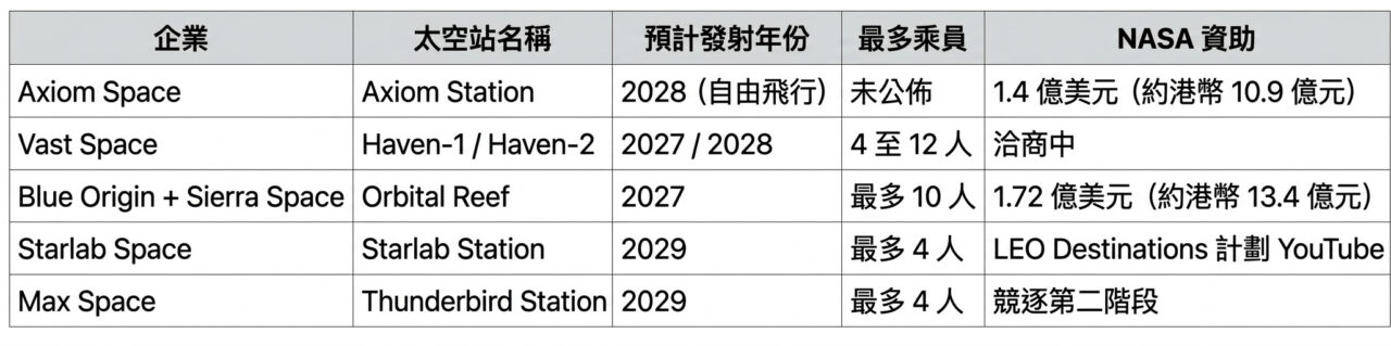 隨著 ISS 退役倒計時進入最後數年,多個商業太空站項目正加速推進。從 2027 年 Axiom Station 及 Haven-1,到 2029 年 Starlab 及 Thunderbird,料將有多個站體在本 10 年末相繼升空,開創商業太空基礎設施新時代。然而技術挑戰、持續融資能力,以及 NASA 第 2 輪合約競爭結果,將是決定各項目命運關鍵。預料未來數年各公司將陸續公佈更多融資進展及研發里程碑,業界動向值得密切追蹤。