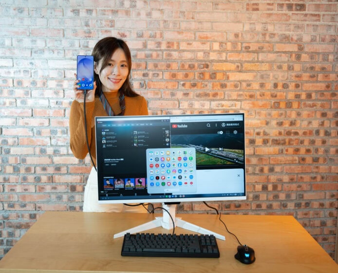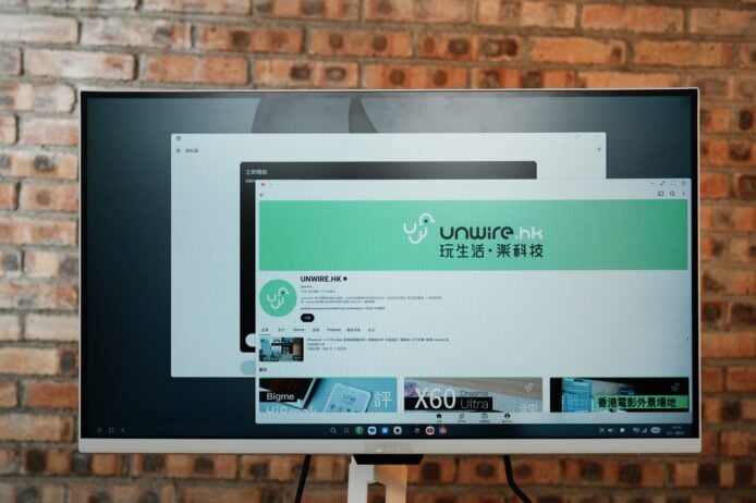 各種應用程式能以自由調整大小視窗形式顯示,畫面底部設有工作列,手機螢幕本身則維持正常運作。