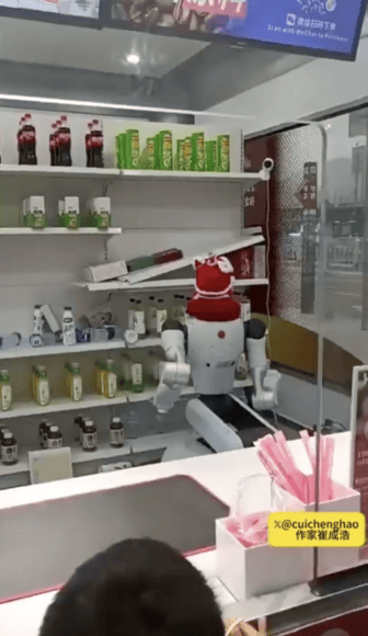 ▲飲料及零食散落一地後,機械人若無其事繼續工作(來源:X)