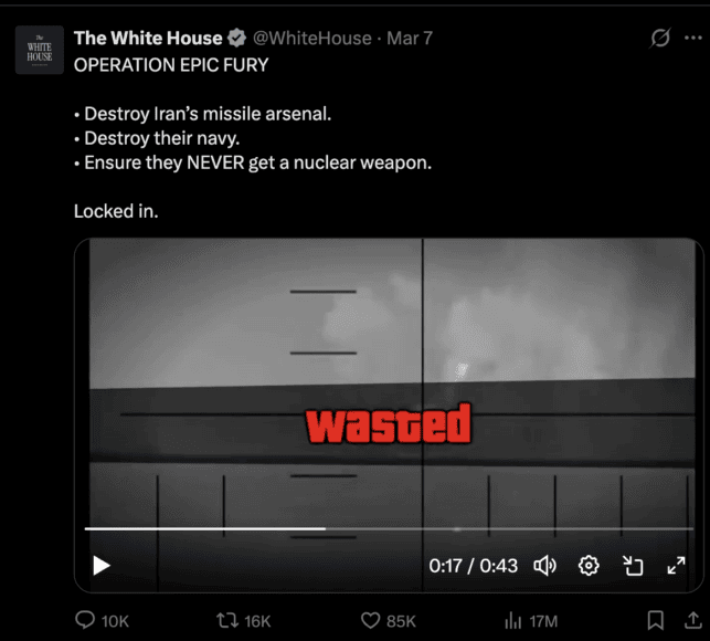 白宮在 X 上發布的首條影片名為《Courtesy of the Red, White & Blue》,片頭取自射擊遊戲《決戰時刻》畫面,剪接航空母艦戰機起飛、導彈發射及引爆目標等打擊伊朗的真實鏡頭,畫面更出現相應玩家的「擊殺得分」。