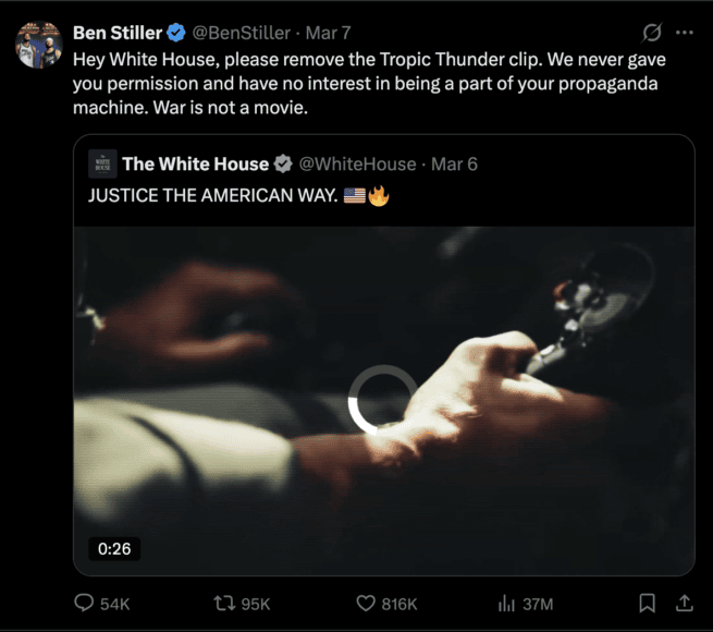 《雷霆喪星》主演兼導演 Ben Stiller 在 X 上公開要求白宮下架影片,原文寫道:「Hey White House,請移除《雷霆喪星》片段。我們從未授權你們使用,亦無意成為你們宣傳機器的一部分。戰爭不是電影。」