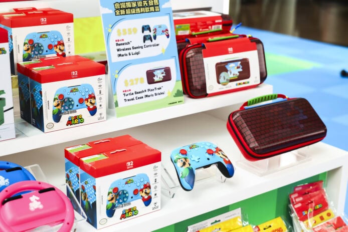 會場精品區售有 Nintendo Switch 2 主機、遊戲軟件、毛公仔、鑰匙扣及收納袋等多款商品。針對 Nintendo Switch 2 研發的 2 款特別控制器及便攜包在會場率先公開發售;預定於 3 月 12 日(四)推出的《閒聊花花》也由活動即日起接受預訂。於會場任何消費可獲精美明信片一張,單次消費達 300 港元更可獲超級瑪利歐立牌一個,特典數量有限,先到先得,送完即止。