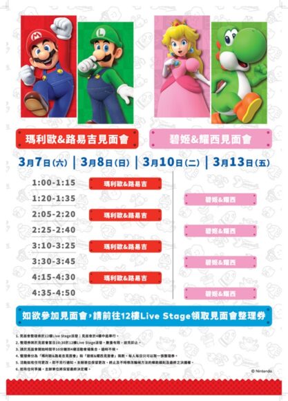 瑪利歐、路易吉、碧姬及耀西將分別於 3 月 7 日(六)、3 月 8 日(日)、3 月 10 日(二)及 3 月 13 日(五)現身與粉絲合照。每日共舉行 4 場,分別於 1:00、2:05、3:10 及 4:15 開始,每場約 35 分鐘。參加者須預先往 12 樓 Live Stage 領取整理券,整理券由當日 10:30 起派發,每人每日限取一張,名額有限,先到先得,並須在見面會開始時間前 10 分鐘到達 4 樓集合。