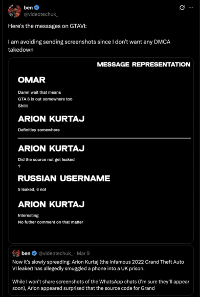 同時 Arion Kurtaj 與多名人士的對話截圖亦流出。Arion Kurtaj 在對話中指原始碼「肯定在某個地方」,但隨即表示不作進一步置評。流出對話包括一名名為 Omar 的人士,Omar 聲稱有多人持有 GTA 6 原始碼,但刻意隱而不發,目的是讓玩家能夠等待 Rockstar Games 正式推出遊戲。Omar 補充:「他們已封存這批資料長達 3.5 年。正因如此,Rockstar 一再延遲,他們也為此感到憂慮。」