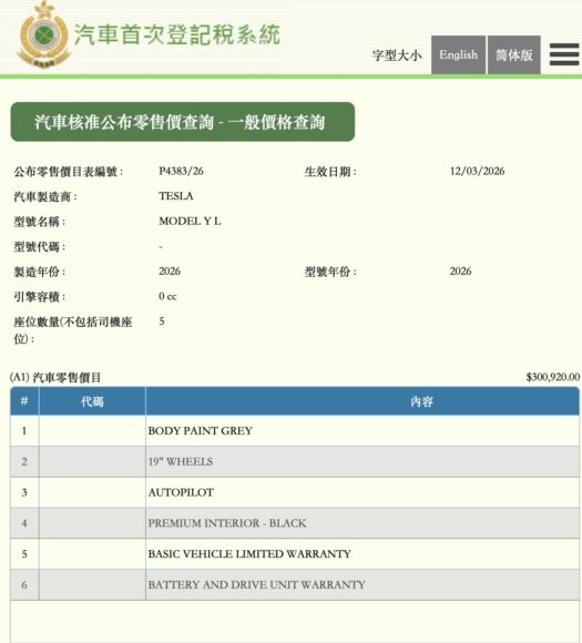Tesla 加長 6 座版 Model Y L 首次登記稅資料近日出現於香港海關系統,編號為 P4383/26,並於 2026 年 3 月 12 日正式生效。資料顯示車輛稅前零售價定為 HK$300,920,繳納首次登記稅後全價為 HK$499,978。這意味 Tesla 有望在港正式推出這款主打家庭市場的加長版電動 SUV。