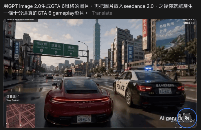 ▲ 有網民利用Images 2.0 搭配 Seedance 2.0,製作仿 GTA 6 畫面 (來源:X)