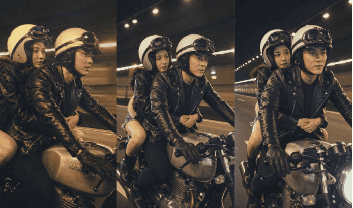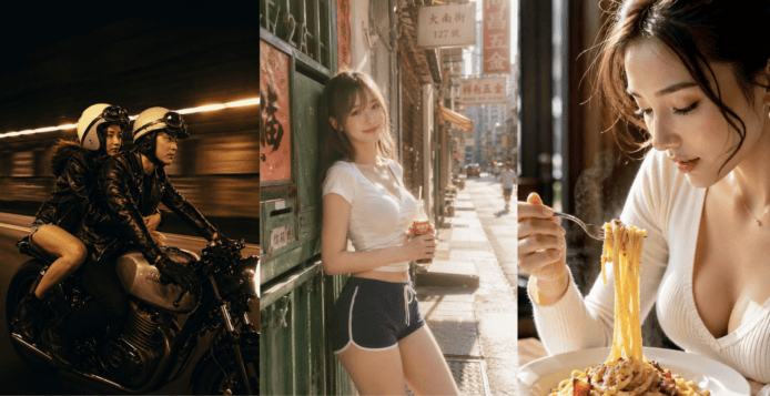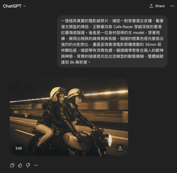 ChatGPT 製圖指令:「一張極其真實的電影感照片,捕捉一對穿著復古皮褸、戴著復古頭盔的情侶,正騎著改裝 Cafe Racer 穿越深夜的香港紅磡海底隧道。後座是一位身材苗條的女 model,穿著短褲,展現出極致的線條美與長腿。隧道的橙黃色燈光營造出強烈的光影對比,畫面呈現香港電影那種懷舊的 35mm 菲林顆粒感,暗部帶有深青色調。鏡頭精準聚焦在兩人的眼神與神態,背景的隧道燈光拉出流線型的動態模糊」
