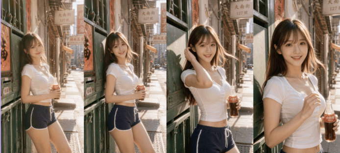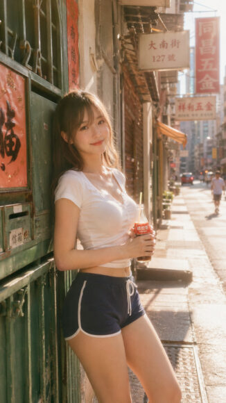 ChatGPT 製圖指令:「一張極其真實且具備日系日常愛情電影感的攝影作品,採用 9:16 垂直比例。場景設定在陽光普照、金影搖曳的午後香港深水埗大南街。強烈而溫暖的陽光穿透過街道,展現出明顯的 Black Mist 濾鏡質感,讓高光部位帶有柔和的擴散光暈(glowing highlights),營造出一種如夢似幻、極致清透的懷舊空氣感。畫面中央是一位氣質清新的女 model,身材苗條且上圍豐滿,穿著簡潔的白色棉質短袖上衣配上深藍色短褲。她手持飲品,正靠在舊唐樓門外的綠色鐵閘旁溫柔地微笑。畫面帶有 35mm 膠片的溫潤色彩,整體細節達到 8k 解析度。」