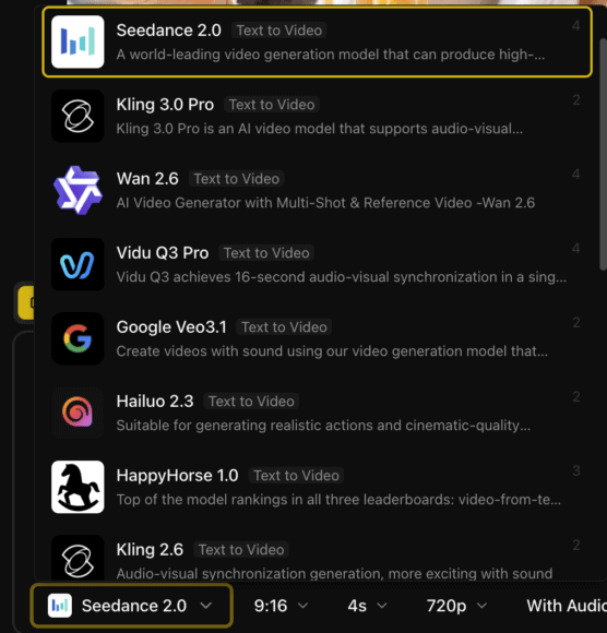 ▲ 從介面可以看到,用家可以根據需求自由切換不同風格的頂級模型,例如追求電影質感的 Kling 3.0 Pro、動態極其豐富的 Wan 2.6,我們今次使用的是 Seedance 2.0 Fast