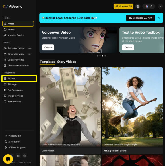 ▲ Videoinu 是一個有 Seedance 2.0 模型的網站,選取 AI Video 便可「圖轉片」