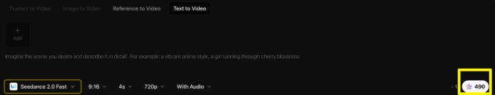 ▲免費用戶通常只有 500 Credit 的初始額度,而使用 Seedance 2.0 Fast 生成一段 720P 的 5 秒影片就需要消耗 495 Credit