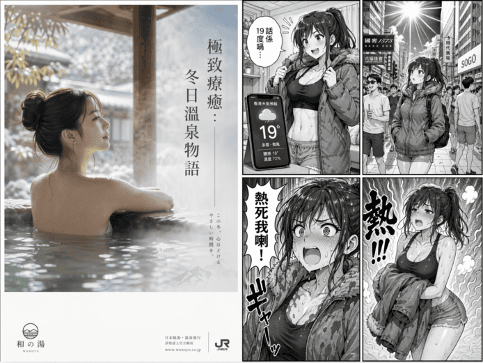 常去日本的朋友,一定見過當地地鐵站內的廣告,其美學精髓在於極簡,通常只用一張具感染力的圖片,配上簡潔有力的垂直標語。我們要求 AI 採用這種風格,生成一張年輕日本女性在露天和風浴場泡溫泉的廣告相,挑戰它處理水汽透明感與精確網格排版的能力。