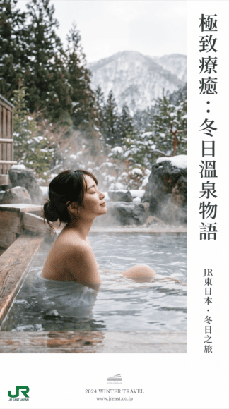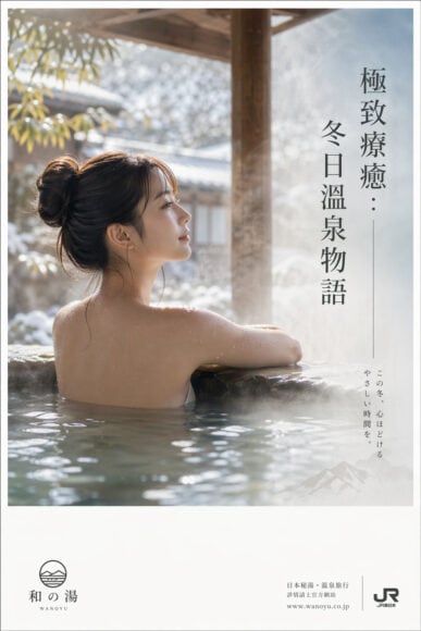 Prompt 參考:「一張專業的日本 JR 地鐵站廣告海報排版。主視覺是一位年輕日本女性在露天和風浴場泡溫泉的側面照,光影呈現出日系感,細緻的水珠與蒸汽效果。排版需嚴格遵守日式極簡網格:右側配合優雅的垂直繁體中文標語『極致療癒:冬日溫泉物語』,海報底部留有乾淨的空白區並帶有微小的模擬企業 Logo 標識。整體呈現出像日本鐵路車站見到的那種高質感、清爽且專業的商業設計。」