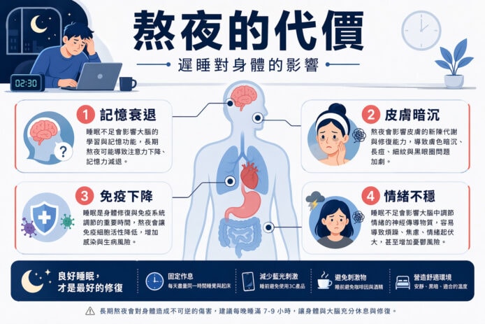 實測 Prompt 參考:「一張專業的醫學科普 Infographic 資訊圖表,主題是『遲瞓對身體的影響』。排版需整齊美觀,中間有一個人體輪廓示意圖。圖表需包含四個重點標註,並用繁體中文寫上標題:1. 記憶衰退、2. 皮膚暗沉、3. 免疫下降、4. 情緒不穩。主標題為『熬夜的代價』。風格採用現代扁平化設計(Modern Flat Design),色彩簡約專業」