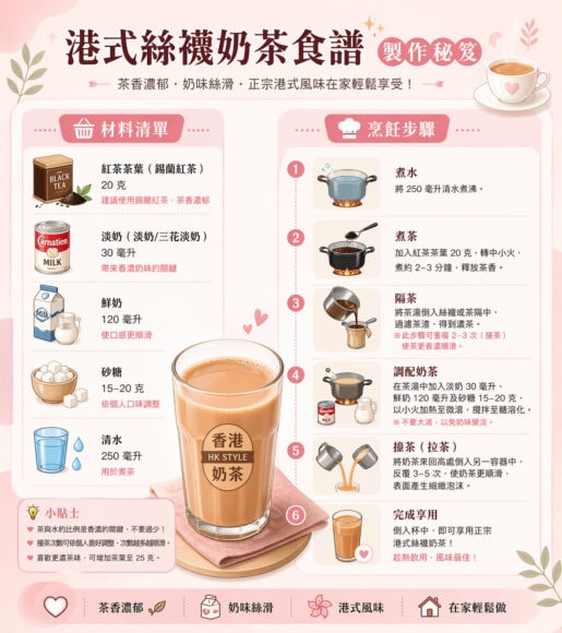 除了健康資訊,讀者也可以製作步驟食譜。例如輸入指令要求製作「港式絲襪奶茶食譜」,AI 能自動安排材料清單、烹飪步驟的圖標(Icon)以及最終成品的展示位,這對於經營生活類社交帳號的用戶來說極具吸引力。