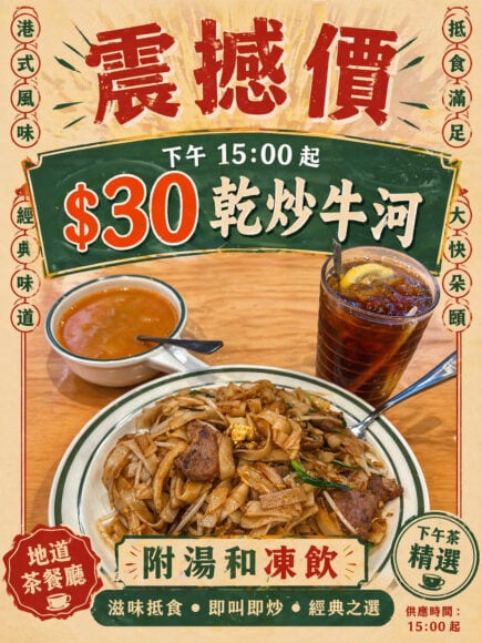 「參考上傳照片中的食物佈局:一碟乾炒牛河,配上一碗羅宋湯和一杯的凍檸茶。將此視覺轉化為一張專業地道的茶餐廳下午茶促銷海報。海報上方用繁體中文寫上『震撼價』,中間橫幅標註『下午 15:00 起 $30 乾炒牛河』,下方註明『附湯和凍飲』。整體設計要地道港式茶餐廳的親切感」