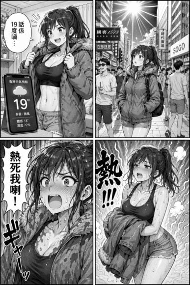第一格:一名身材苗條、擁有健美線條的女大學生在家看天氣預報,手機顯示為 19 度,她正興奮地穿上一件厚風褸。