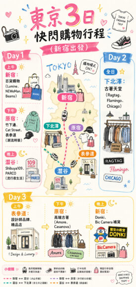 ▲生成的圖表排版非常美觀,不僅列出了每日行程(Day 1 新宿/原宿/澀谷、Day 2 下北澤古著、Day 3 表參道精選),更自動配上相對應的店鋪標誌如 Donki、BicCamera 等。畫面中央的地圖輪廓清晰勾勒出交通路徑,底部甚至主動附上了「打卡拍照」、「預留行李空間」等小提醒
